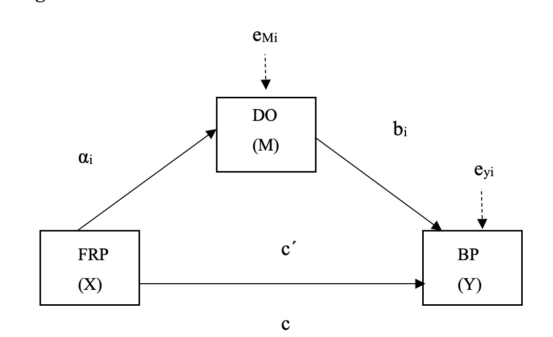 Para analizar el efecto mediador del DO entre los FRP y el BP se utilizó el método de mediación estadística de Baron y Kenny (1986) la cual es una estrategia de análisis para probar hipótesis de mediación. Este método establece que la variable independiente debe predecir la variable dependiente y también debe predecir el mediador y a su vez el mediador debe tener un efecto sobre la relación entre la variable independiente y dependiente. El paquete estadístico usado para este análisis fue SPSS versión 26 así como su macro process de Hayes (2013), y se aplicó la técnica bootstrapping de 10000 submuestras con el 95% de confianza. Los resultados revelan un efecto positivo estadísticamente significativo entre FRP y DO (BFRP= .36, p <.001), además, el efecto entre el DO y BP resultó negativo y significativo (BDO=-.40, p <.001) al igual que el efecto de FRP con BP (BFRP´= -.05, p=.51). El efecto indirecto del DO entre los FRP y el BP resultó negativo y significativo (B= -.14, SE= .04, 95%, CI [-.24, -.06]) lo que indica que los FRP explican el 5% de la varianza del BP cuando el DO no está presente, sin embargo, cuando el DO está presente, la varianza aumenta.