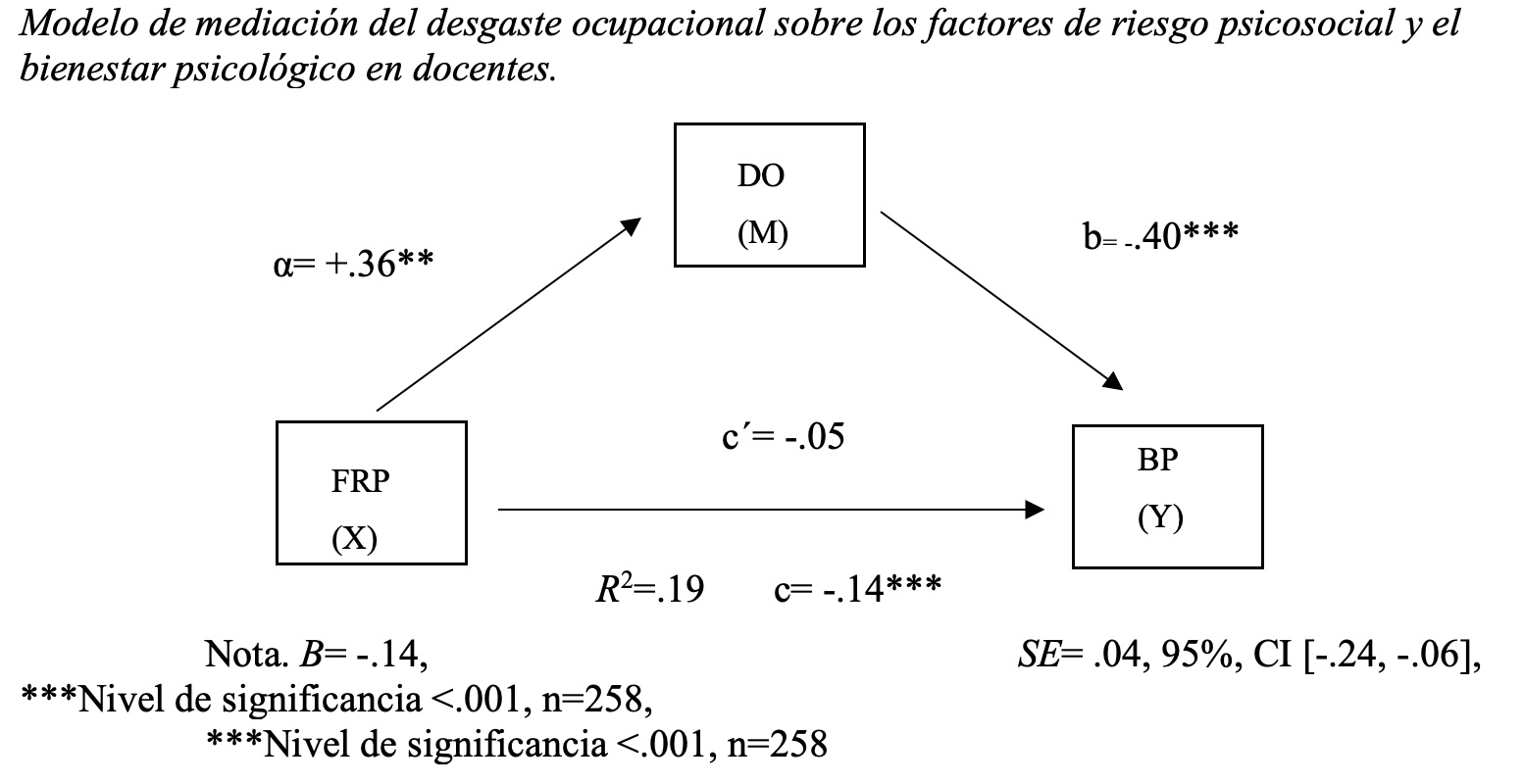 Se corrobora la relación e interacción entre las variables analizadas como se esperaba y se comprueba la hipótesis de que el Desgaste Ocupacional media la relación entre los Factores de Riesgo Psicosocial y el Bienestar Psicológico, por lo cual los hallazgos son trascendentes porque fundamentan bases sólidas para el desarrollo del bienestar psicológico en el ámbito laboral de los y las docentes y se contribuye al estudio sistemático de los Factores de Riesgo Psicosocial, el Desgaste Ocupacional y el Bienestar Psicológico, sumando evidencia para argumentar la necesidad de promover el diseño e implementación de programas de prevención, intervención y promoción de este último bajo la premisa de que un docente con bienestar psicológico será capaz de desempeñar su labor de manera más eficiente en el quehacer formativo de sus educandos.